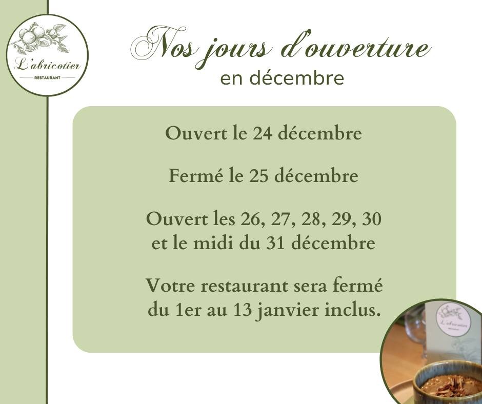 Vente de plats à emporter : Les soirs du Mercredi au samedi de 18h à 20h30